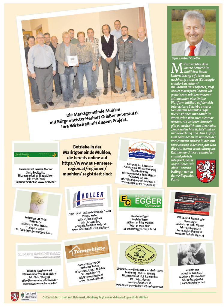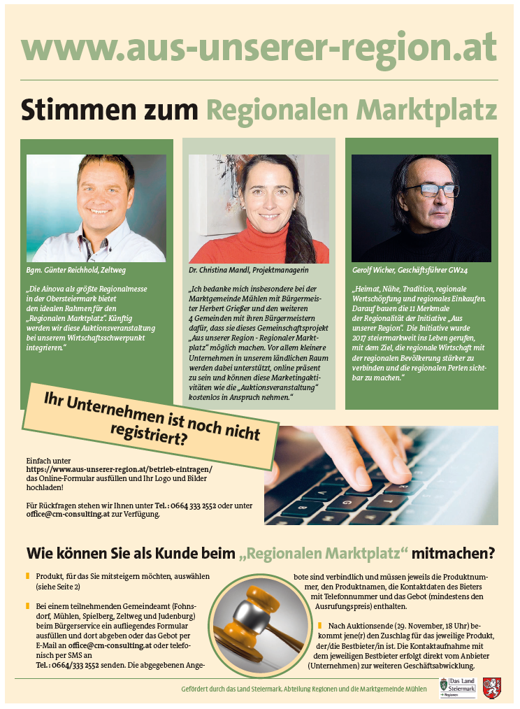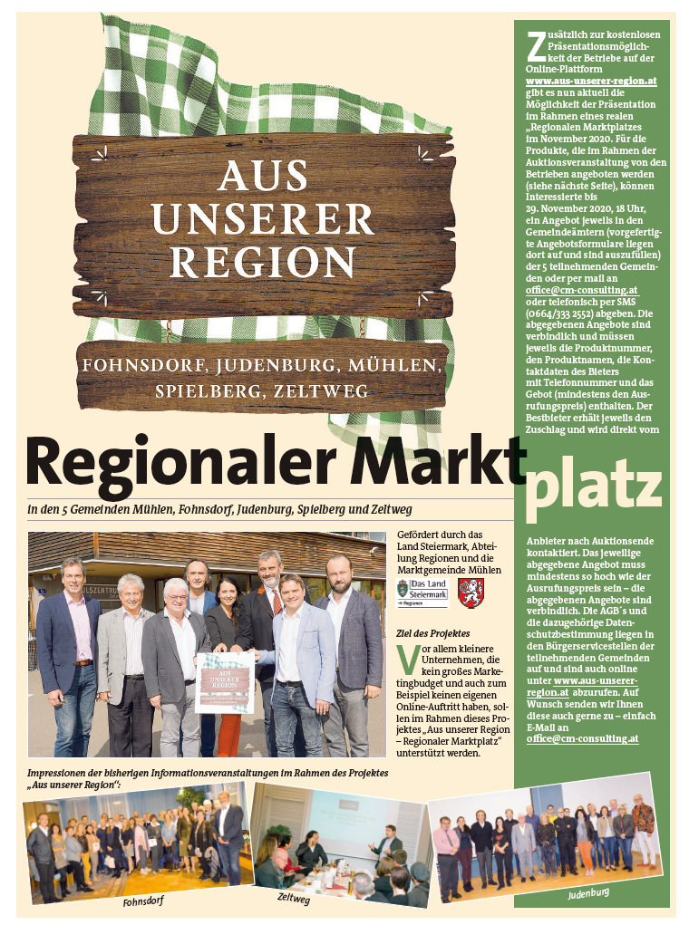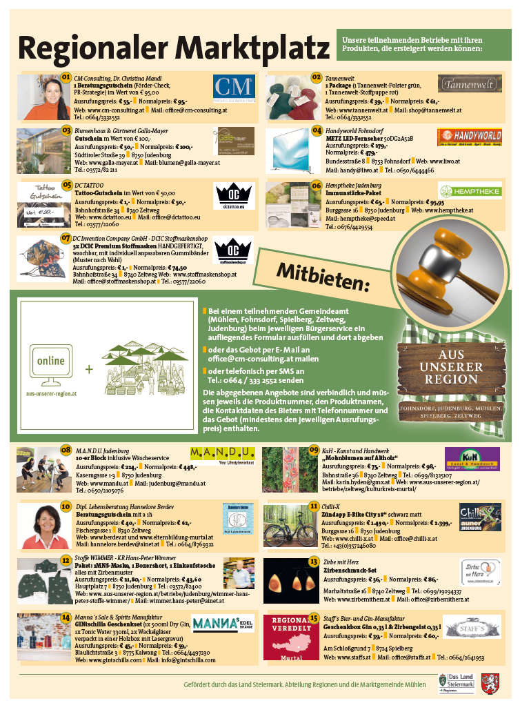 Der "Regionale Marktplatz" ist ein gemeinsames Projekt der Gemeinden Spielberg, Judenburg, Fohnsdorf, Zeltweg und Mühlen. Aktuell startet eine Auktionsveranstaltung mit vielen tollen Angeboten heimischer Betriebe. Jetzt schnell zuschlagen und auf das gewünschte Produkt bieten!!!