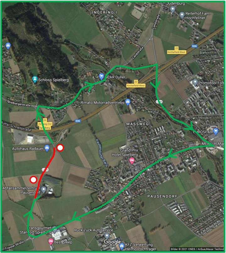 Das Abfallsammelzentrum Pausendorf ist auf Grund von Bauarbeiten für die nächsten zehn Wochen nur vom Süden erreichbar. Die Umleitung vom Autobahnzubringer erfolgt über die Spielberger Straße - Landesstraße - L549 - Kreisverkehr Kolibri Center - Triesters Straße - Kreisverkehr Transgourmet - L545.