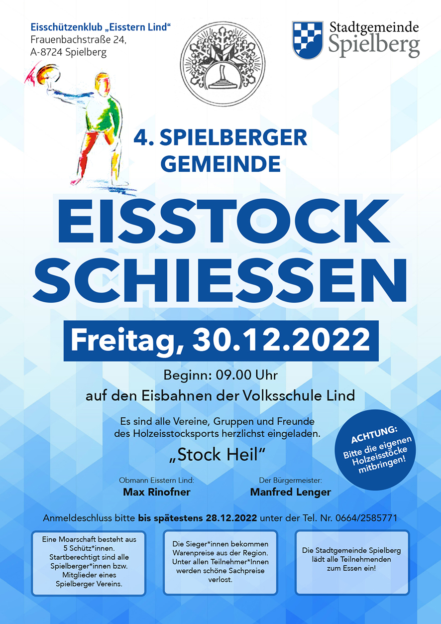 Der Eissschützenklub "Eisstern Lind" und die Stadtgemeinde Spielberg freuen sich schon auf zahlreiche Moarschaften beim 4. Spielberger Gemeinde Eisstockschießen am Freitag, 30. Dezember 2022.