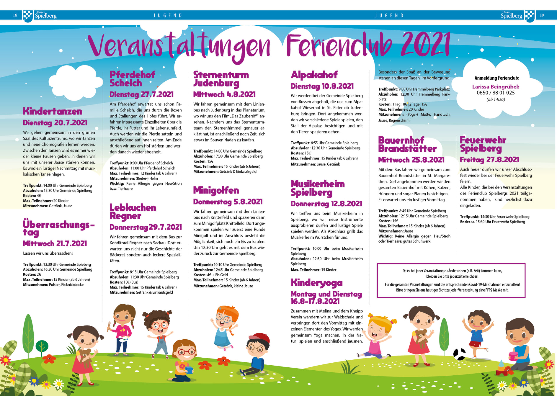 Langsam aber sicher nähern sich die Sommerferien und so ist es wieder an der Zeit für unseren beliebten Ferienclub. Heuer erwartet die Kinder ab Juli mit elf verschiedenen Veranstaltungen ein besonders abwechslungsreiches Programm. Anmeldungen bei Frau Beingrübel unter 0650 88 01 025 (ab 14 Uhr)