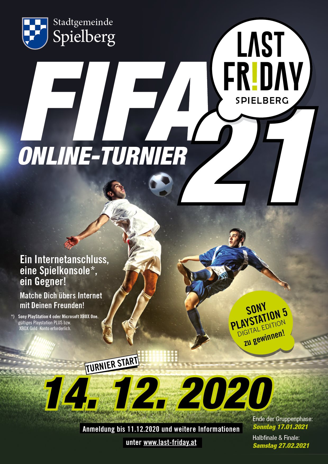Bei dir und deinen Freunden herrscht Langeweile? Matche dich jetzt übers Internet mit deinen Freunden beim FIFA21 Online-Turnier der Stadt Spielberg und gewinne tolle Preise. Turnierstart ist am 14.12.2020. Bis spätestens 11.12.2020 könnt ihr euch online anmelden unter www.last-friday.at