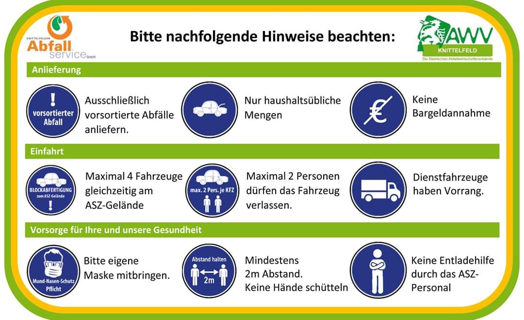 Das Abfallzentrum Pausendorf ist von Montag bis Freitag (7 bis 15 Uhr) wieder geöffnet. Aufgrund der Sicherheitsbestimmungen ist mit längeren Wartezeiten zu rechnen. Bitte beachten Sie die Hinweistafel.