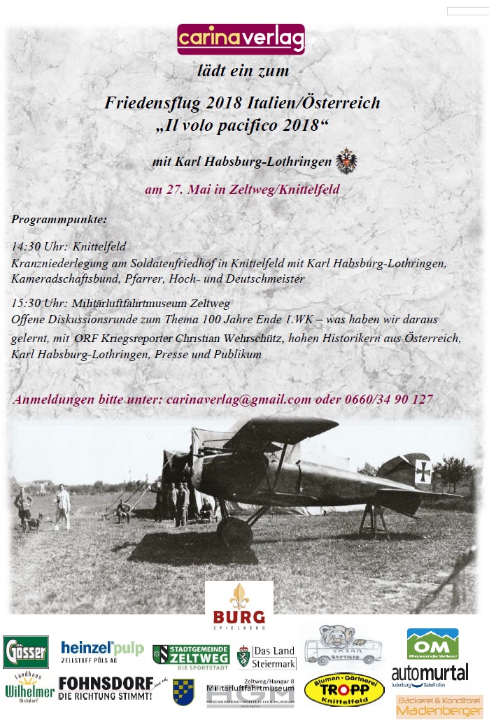 Carina Verlag lädt am 27. Mai zum Friedensflug 2018 Italien/Österrerich "Il volo pacifico 2018" mit Karl Habsburg -Lothringen.