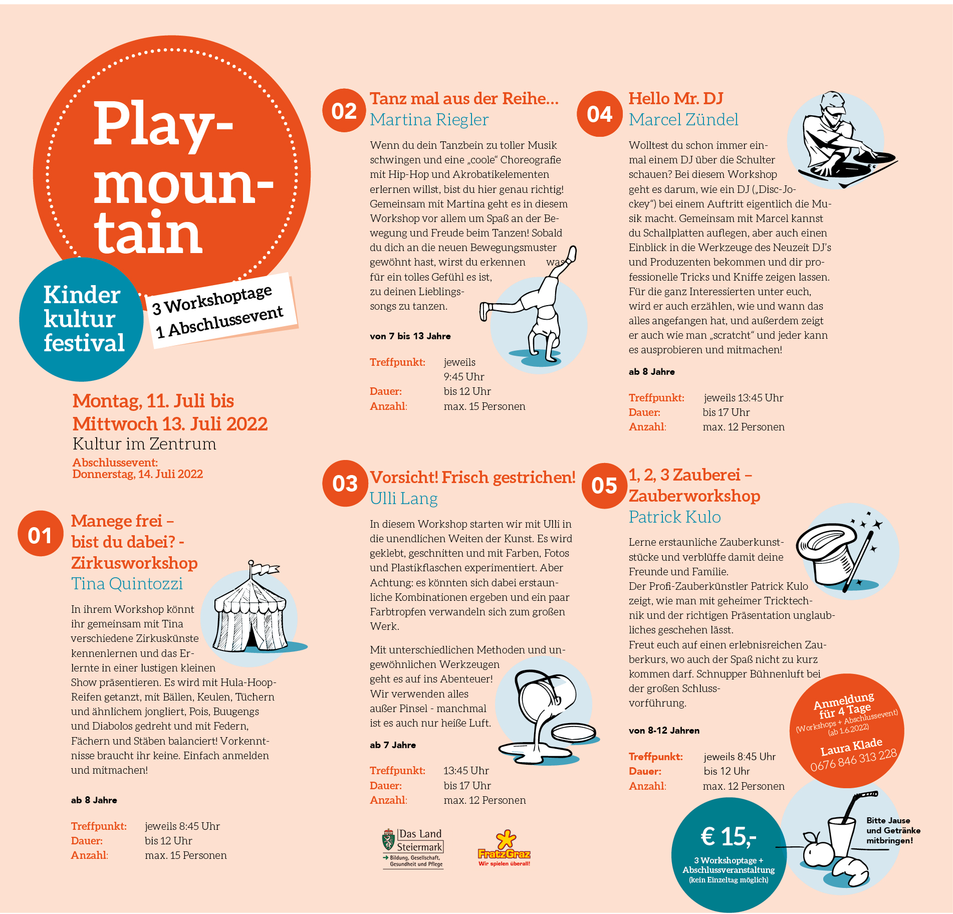 Mit unserem Kinderkulturfestival „Playmountain 2.0“ starten wir von 11. bis 14. Juli in die diesjährigen Sommerferien. Ein toller Auftakt für unseren Ferienclub 2022! Es gibt noch freie Plätze! Liebe Kinder, wir freuen uns auf euch!