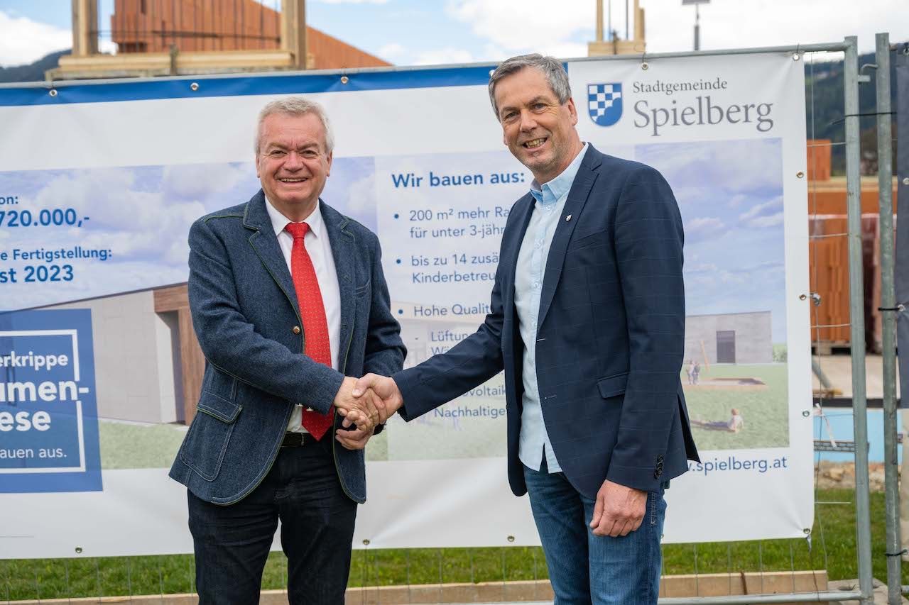 „Das Thema der Elementarpädagogik liegt mir besonders am Herzen, deshalb freut es mich, dass wir gemeinsam mit unseren Städten und Gemeinden den Ausbau der Kinderbildungs- und Betreuungsreinrichtungen weiter vorantreiben. Das Land hat erst letzte Woche eine große Reform der Elementarpädagogik vorgestellt, bei der insgesamt 270 Millionen für eine Qualitätsoffensive (z.B.: Senkung der Gruppengrößen, geringere Elternbeiträge in der Kinderkrippe) und den Ausbau investiert. Aber auch für die Schülerinnen und Schüler in Spielberg passiert viel: mit der Sanierung der Volksschule beweist Spielberg, dass sie auf modernste Bildung setzt und damit direkt in die Zukunft der Kinder investiert wird. Es freut mich zu sehen, dass bei beiden Projekten bereits wesentliche Fortschritte erzielt werden konnten. Ich bin überzeugt davon, dass sowohl die Kinder als auch die Pädagog*innen und Lehrer*innen viel Freude in den Einrichtungen haben werden“, sagt der für Spielberg zuständige Gemeindereferent Landeshauptmann-Stv. Anton Lang.