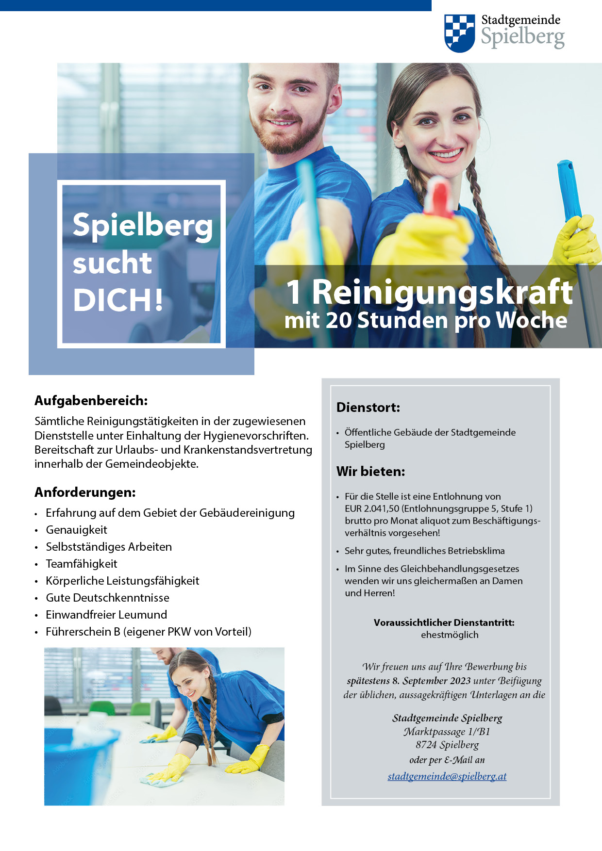 Die Stadtgemeinde Spielberg sucht Verstärkung für unser engagiertes Reinigungsteam! Jetzt bewerben: Alle Details rund um die ausgeschriebene Stelle gibt es hier.