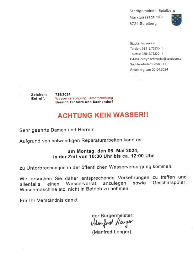 Am Montag, den 6. Mai 2024 kann es aufgrund von Reparaturarbeiten in der Zeit von 10.00 bis 12.00 Uhr in folgenden Gemeindegebieten zu Unterbrechungen in der öfffentlichen Wasserversorgung kommen: Florianiweg (7c-19); Lorenzgasse; Einhörnstraße (1-34); Tremmelweg (8-14); Rainweg (1-19); Waldrandstraße. Die betroffenen Haushalte wurden mit einem Informationsschreiben verständigt. Wir bitten um Verständnis!