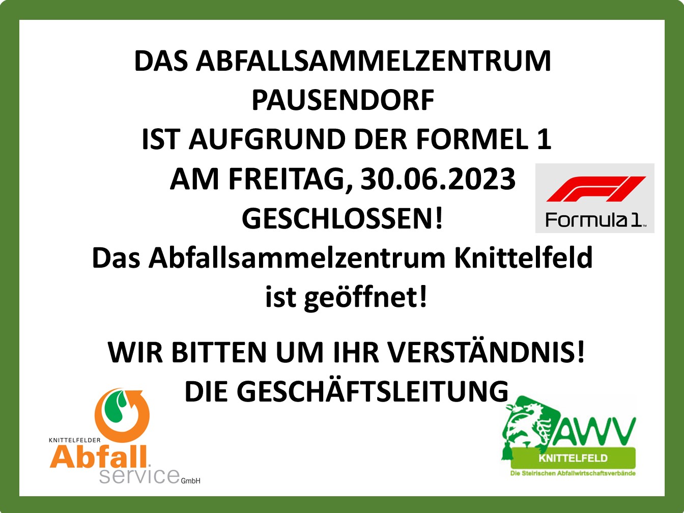 Das Abfallsammelzentrum Pausendorf ist aufgrund der Formel 1 am Freitag, 30. Juni 2023 geschlossen! Wir bitten um Ihr Verständnis!