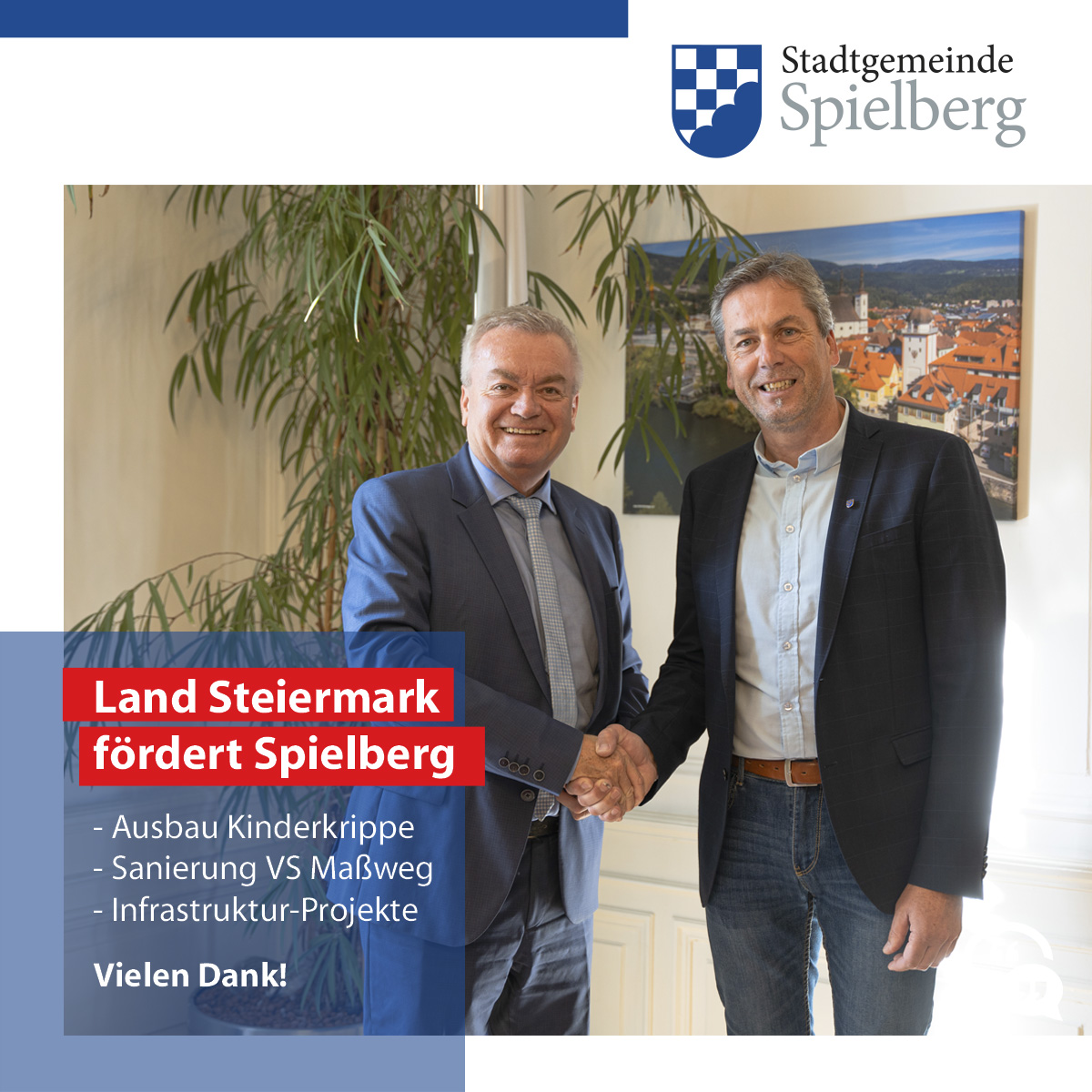 Am Dienstag 17. Oktober konnte Bürgermeister Manfred Lenger bei einem gemeinsamen Termin mit Landeshauptmann-Stv. Anton Lang in Graz erfolgreiche Gespräche über zukünftige Bedarfszuweisungen seitens des Landes Steiermark zur Finanzierung wichtiger Großprojekte in Spielberg führen.