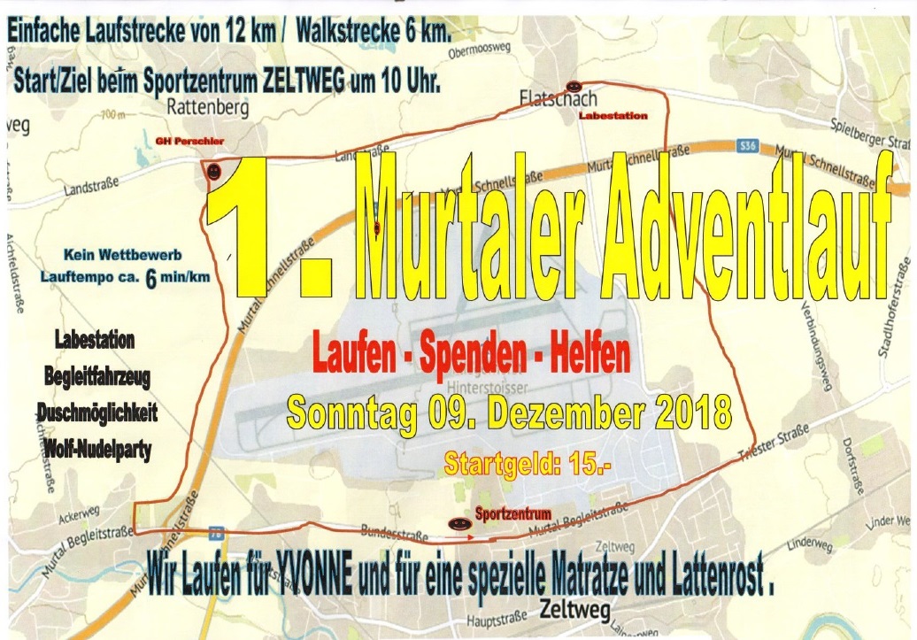 "Laufen-Spenden-Helfen" lautet das Motto beim 1. Murtaler Adventlauf am 9.12.2018 um 10 Uhr. Start/Ziel ist das Sportzentrum Zeltweg. Neben der 12 km Laufstrecke wartet auch eine 6 km Walkingstrecke auf alle Bewegungsbegeisterten. Stargeld: 15 Euro