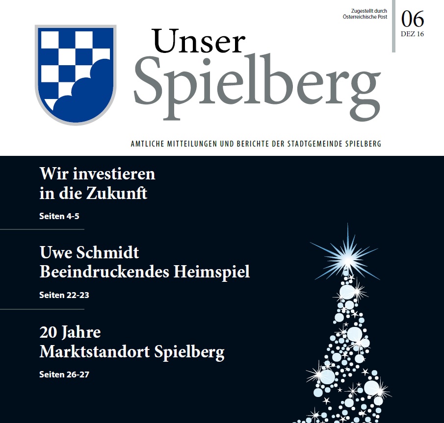 Die bereits 6. Ausgabe in diesem Jahr und unsere Weihnachtsausgabe von "Unser Spielberg" ist ab sofort auch online unter https://www.spielberg.at/index.php/gemeindezeitung verfügbar.