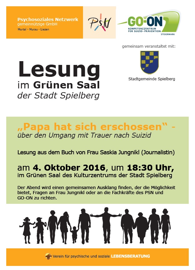 Unter dem Titel "Papa hat sich erschossen" - über den Umgang mit Trauer nach Suizid findet im Oktober eine Lesung der Journalistin Saskia Jungnikl im Grünen Saal der Stadt Spielberg statt.