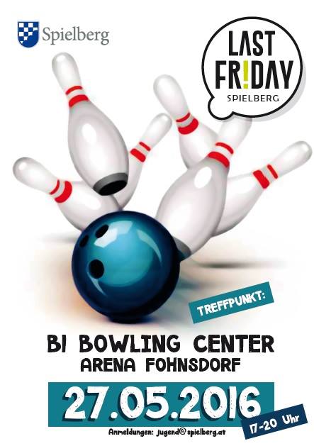 Auch im Mai findet am letzten Freitag im Monat wieder eine Veranstaltung des "Last Friday" Jugendveranstaltungsformats der Stadtgemeinde Spielberg statt. Diesmal dürfen sich alle Bowlingfreunde auf einen lustigen Nachmittag in der Bowlingarena freuen. Anmeldungen unter: jugend@spielberg.at