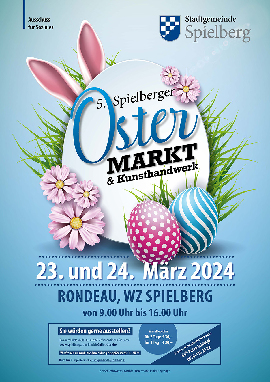 Der Spielberger Ostermarkt findet heuer erstmals an zwei Tagen statt! Am Samstag, 23. und Sonntag, 24. März 2024 haben Sie von 9.00 bis 16.00 Uhr die Gelegenheit im Spielberger Rondeau zu gustieren und eine frühlingshafte Osterstimmung zu genießen! Zahlreiche Austeller:innen und Spielbergs Sozialausschuss freuen sich auf Ihren Besuch!