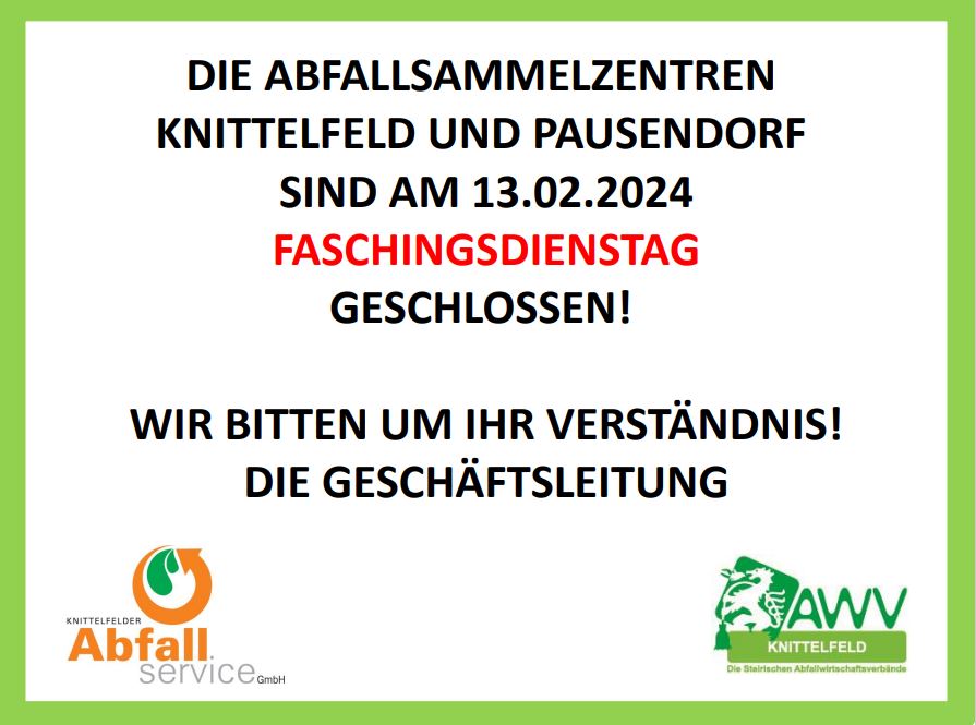 Im Namen des Abfallwirtschaftsverbands Knittelfeld dürfen wir Sie darüber informieren, dass das Abfallsammelzentrum in Pausendorf am Dienstag, 13. Februar geschlossen sein wird. Wir bitten um Verständnis!