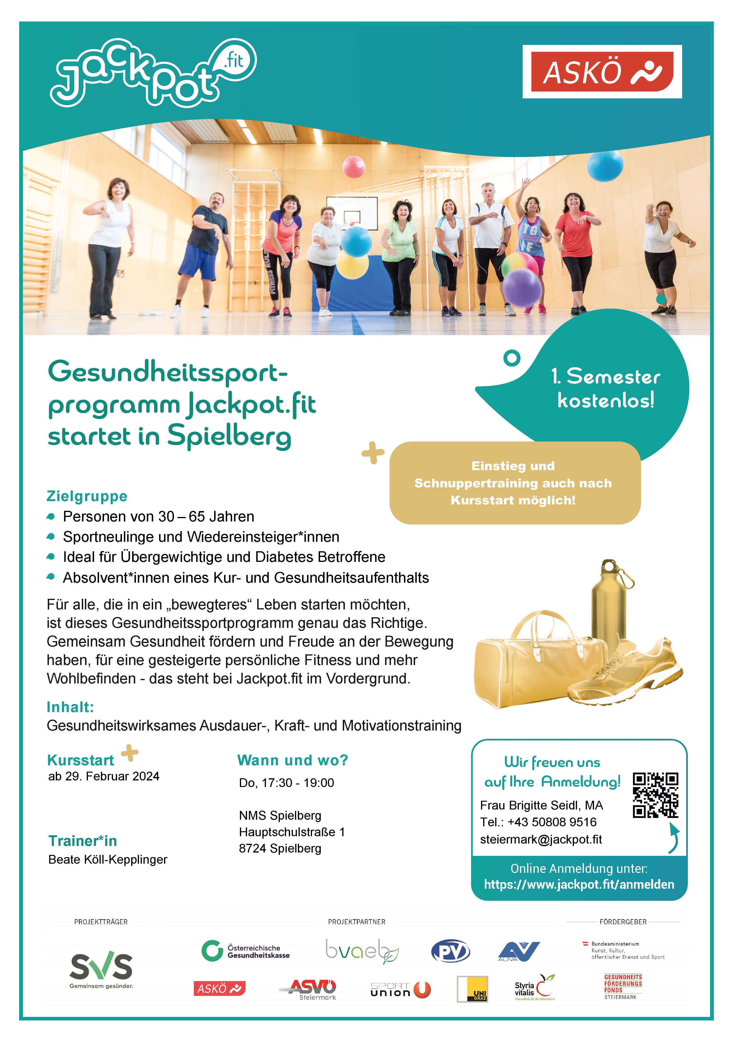 Für alle, die in ein "bewegteres" Leben starten möchten: Am 29. Februar 2024 beginnt das "Jackpot.fit"-Programm in Spielberg. Das erste Semester ist kostenlos! Nähere Infos auch unter www.jackpot.fit.